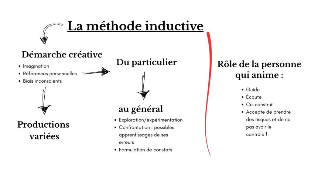 ***Image source. Translation: The Inductive Method. Creative Approach: imagination; personal references; unconscious bias. Varied Productions. Specific. General: exploration and experimentation; confrontation: possibility to learn from one's mistakes; formulation of observations. Role of the facilitator: Guide; listen; co-construct; agree to take risks and to not be in control.